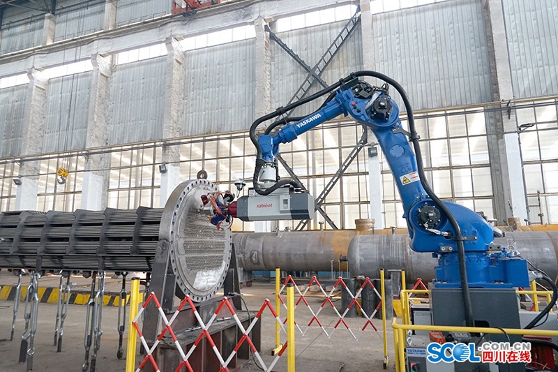 在德阳东汽电站机械制造有限公司机加车间,焊接机器人挥动着灵活的“手臂”,精准地对产品进行焊接作业。另一旁,技术工人操控着数控双头钻对产品进行激光切割,整个过程更加安全高效。