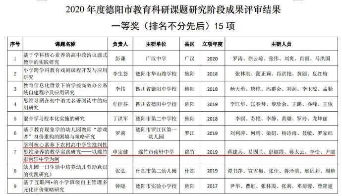 四川在线德阳消息 近日,“2020年度德阳市教育科研课题研究阶段性成果评审结果”公布,绵竹市南轩中学德阳市级教育科研课题《学科核心素养下农村高中学生批判性思维培养的教学实践研究》,在参评的94项课题中脱颖而出,获得德阳市教育科研课题研究阶段成果一等奖。