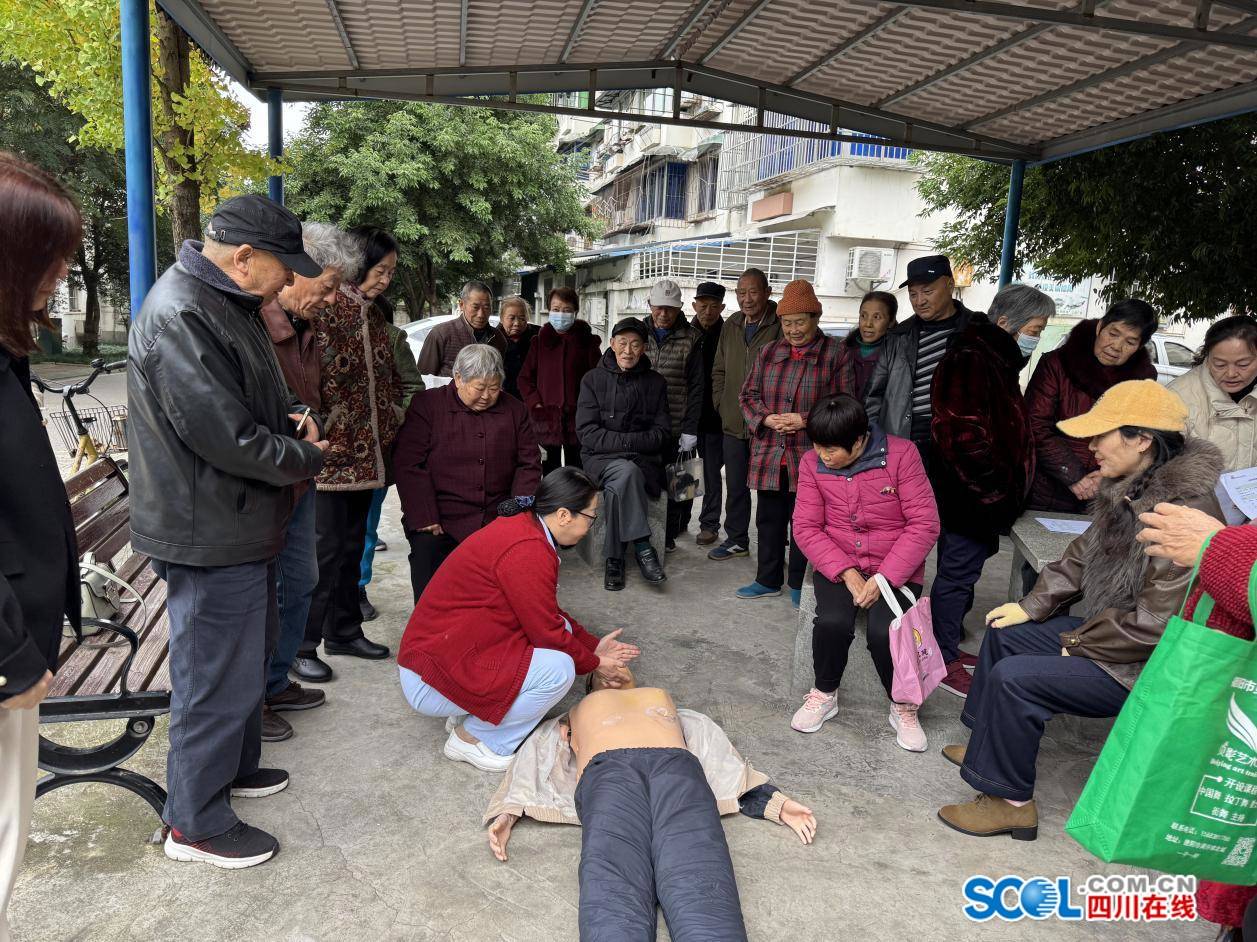 在铁西社区休闲广场的另一侧,一场紧张有序的心肺复苏应急救护培训正在进行。德阳第五医院护理部范春虹结合真实急救案例,细致拆解心肺复苏操作流程,为大家讲解了遇到突发紧急情况时正确的救援步骤,并通过模拟人现场演示了心肺复苏抢救流程和注意事项。居民们学习热情高涨,纷纷上前进行实操练习。