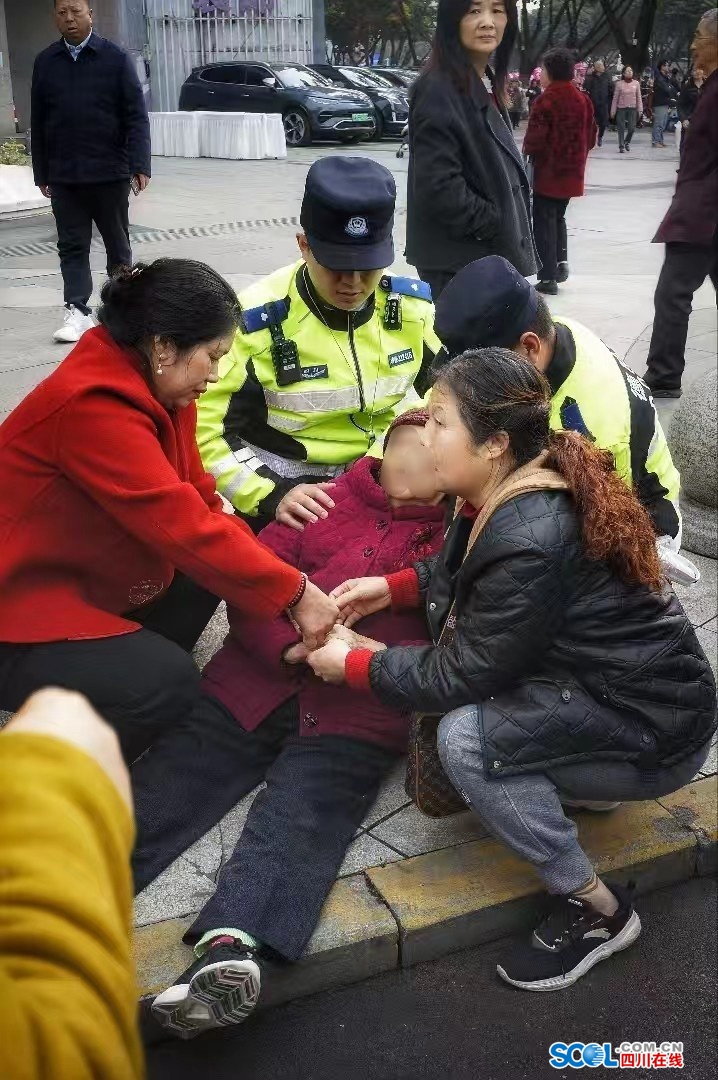 刘盛成立即通过对讲机向指挥中心汇报情况,同步拨打120急救电话,并俯身轻声安抚老人,密切观察其生命体征;胡志鹏快速疏散周边围观群众,及时开辟生命通道,避免人群拥挤造成二次伤害,同时疏导现场交通,确保救护车通行顺畅。