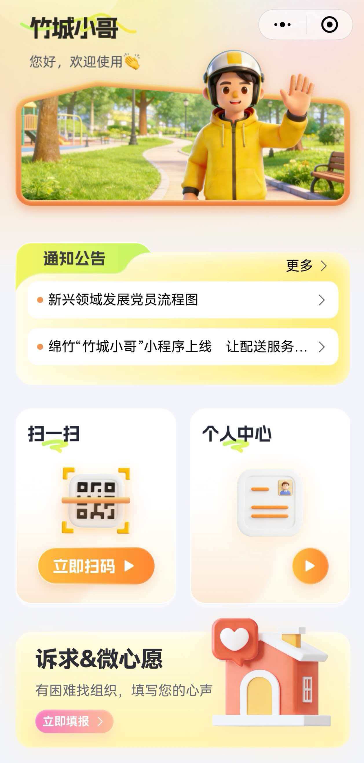 除扫码通行外,“竹城小哥”还设有“通知公告”板块,发布道路信息、党建动态等;“诉求&微心愿”板块则开通骑手诉求征集通道,可在线提交困难、建议或个人愿望,由社区、物业或爱心企业认领对接,实现“你说我办、精准响应”。