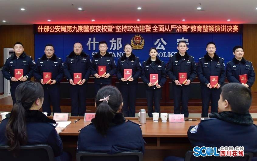 四川在线消息 12月8日晚,什邡市公安局利用警察夜校举行“坚持政治建警全面从严治警”主题演讲比赛决赛。10名来自基层所队和机关的民、辅警选手,60余名基层民、辅警和职工代表参加活动。 本次主题演讲比赛,由全局35个党支部选派队员参加预赛,并从其中挑选预赛成绩排名前10的优秀民、辅警进入决赛。