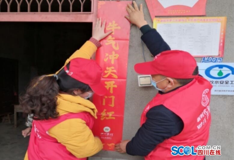 “上面一点,就这个位置,稳住......”在帮扶对象范大爷家中,罗江区综合行政执法局志愿者们正在为范大爷贴春联、和福字。当天,罗江区综合行政执法局共为结对帮扶的100余户脱贫户送上了白面、牛奶、棉被、等慰问品,并为部份脱贫户张贴春联,送去了党和政府的关心和关爱,彰显出浓浓的“亲情”。同时还结合近期疫情防控工作进行了疫情知识宣讲,祝希望大家在欢度春节的同时做好个人防护防疫工作。