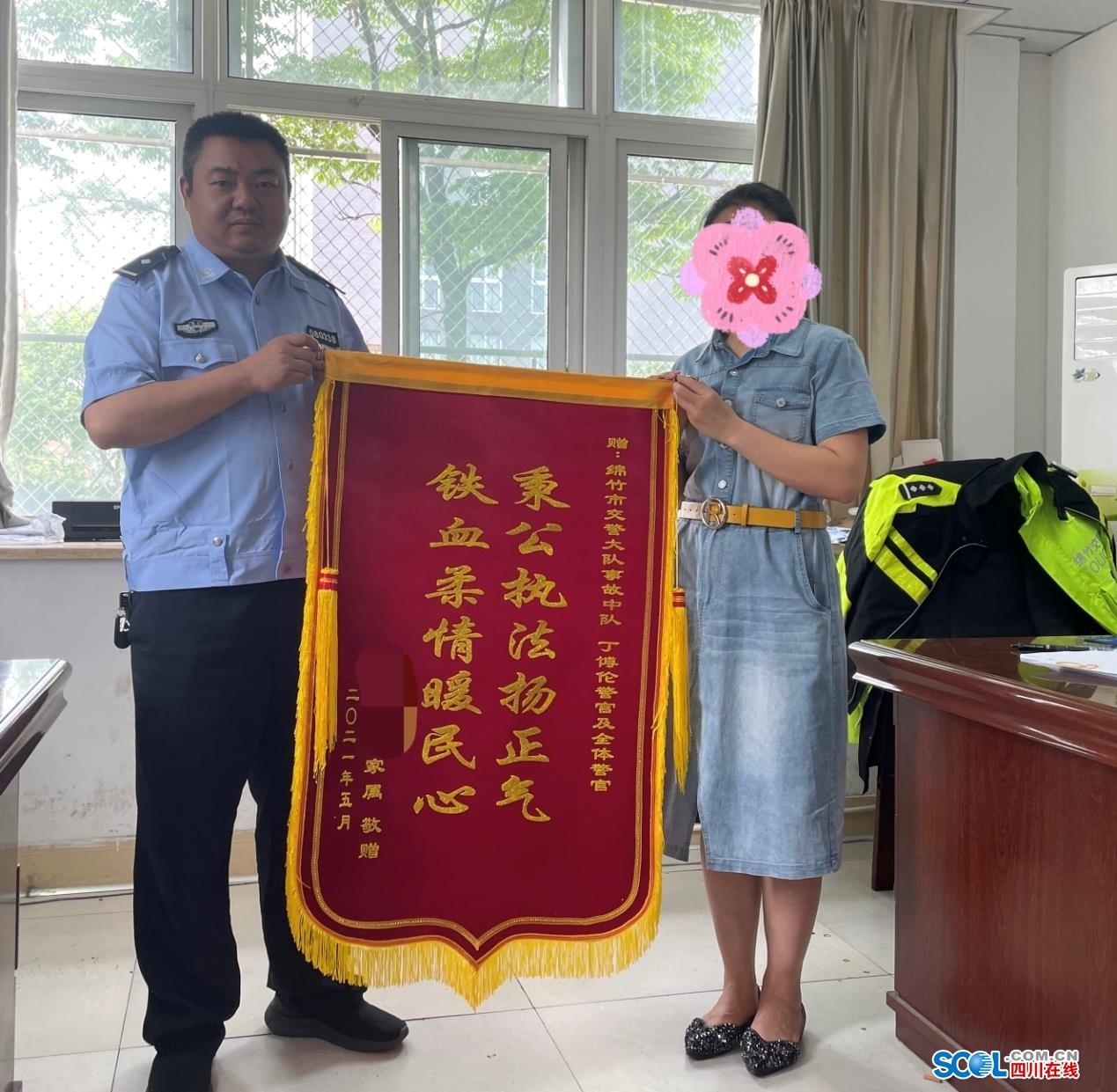 5月19日上午,李某的家属将一面印着“秉公执法扬正气 铁血柔情暖民心”的锦旗送到了民警的手中,感谢绵竹公安帮助解决了一家人的燃眉之急。(周韵 唐琦)