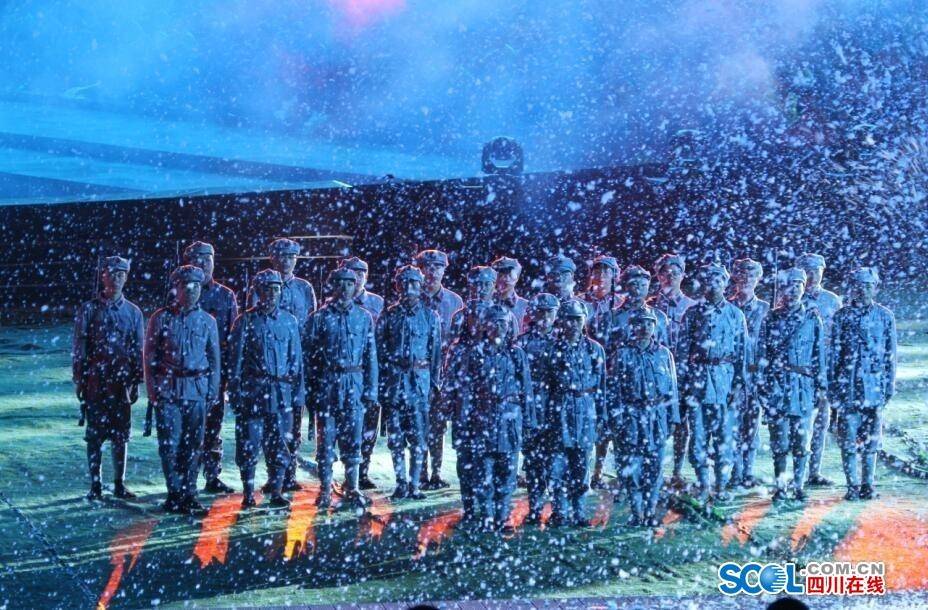 “星火燎原”篇章以情景剧拉开演出序幕,由五四运动到党的一大宣告中国共产党正式成立,通过宏大叙事的方式展现了党的发展历程。实景演出《红动中国》展示了1919年五四运动马克思主义进入中国,红色的种子在中国大地迅速蔓延开来。《红船记忆》根据史料复原一大的召开,标志着中国共产党正式成立,犹如一轮红日在东方冉冉升起,照亮中国革命的前程。情景大合唱《遵义会议放光辉》《过雪山草地》结合实景演员、造雪机、LED等多种舞台元素进行场景化还原,演绎出《长征组歌》中两个经典片段。