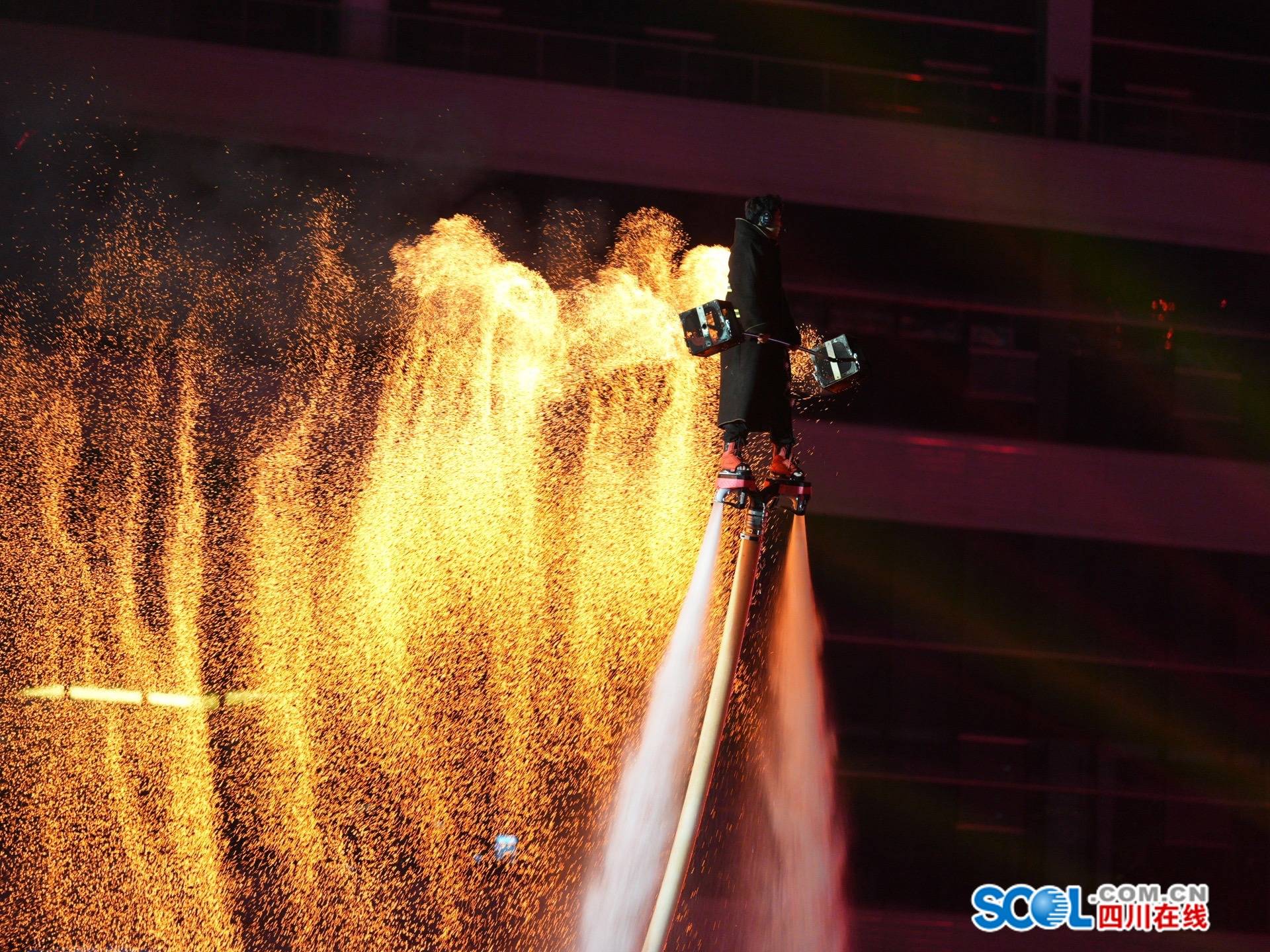 晚上19时30分,伴随着悠扬的旋律,燃烧的火壶从湖面腾空而起。文德湖上,火壶随着表演者的动作旋转升腾,时而如流星疾驰,时而似展翅飞鸟。夜空中,焰火与灯光热烈交织,共同勾勒出一个奇幻光影世界。