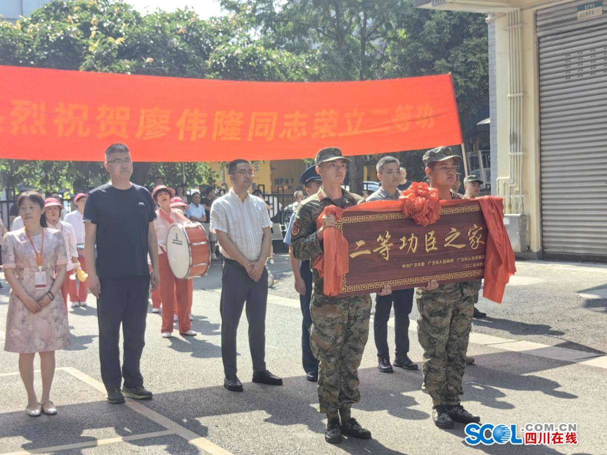 当天上午,慰问团来到广汉市雒城街道光华社区。在激昂的锣鼓声和热烈的掌声中,慰问团成员为廖伟隆及其家人佩戴上鲜红的绶带,并将鲜花、二等功喜报及慰问金郑重地交到他们手中。当二等功匾额被众人合力抬进功臣家中时,红花与荣誉匾额交相辉映,映衬着军人家庭的无限荣光。