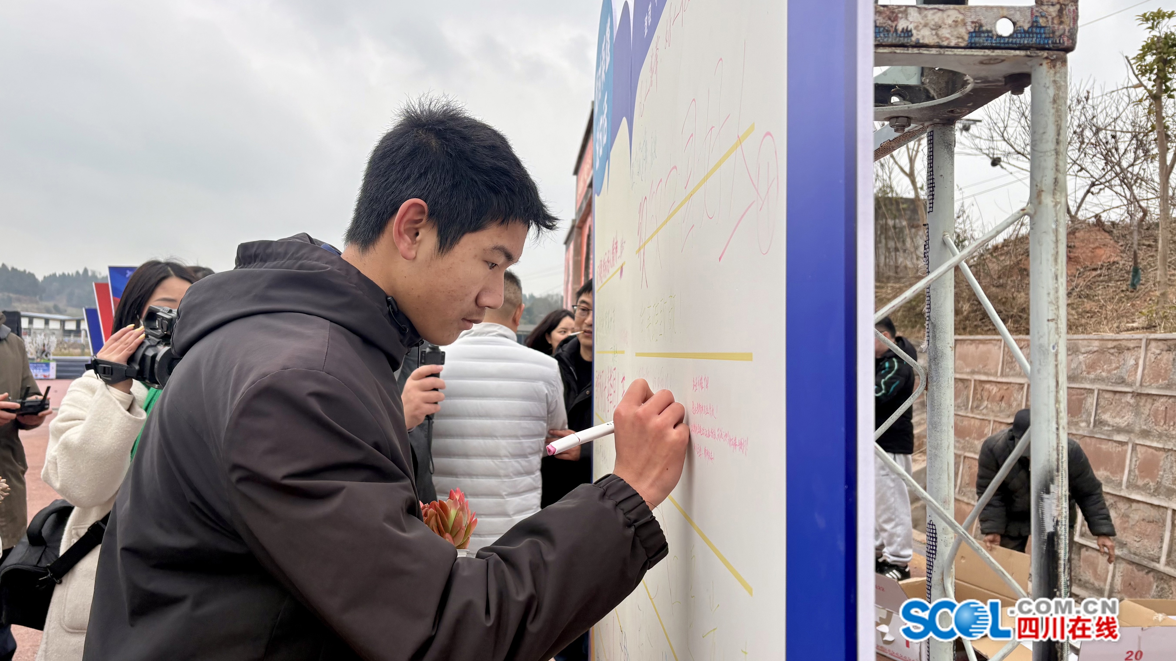 刘应强的儿子刘晨瑞在现场展板写下寄语。唐茜 摄