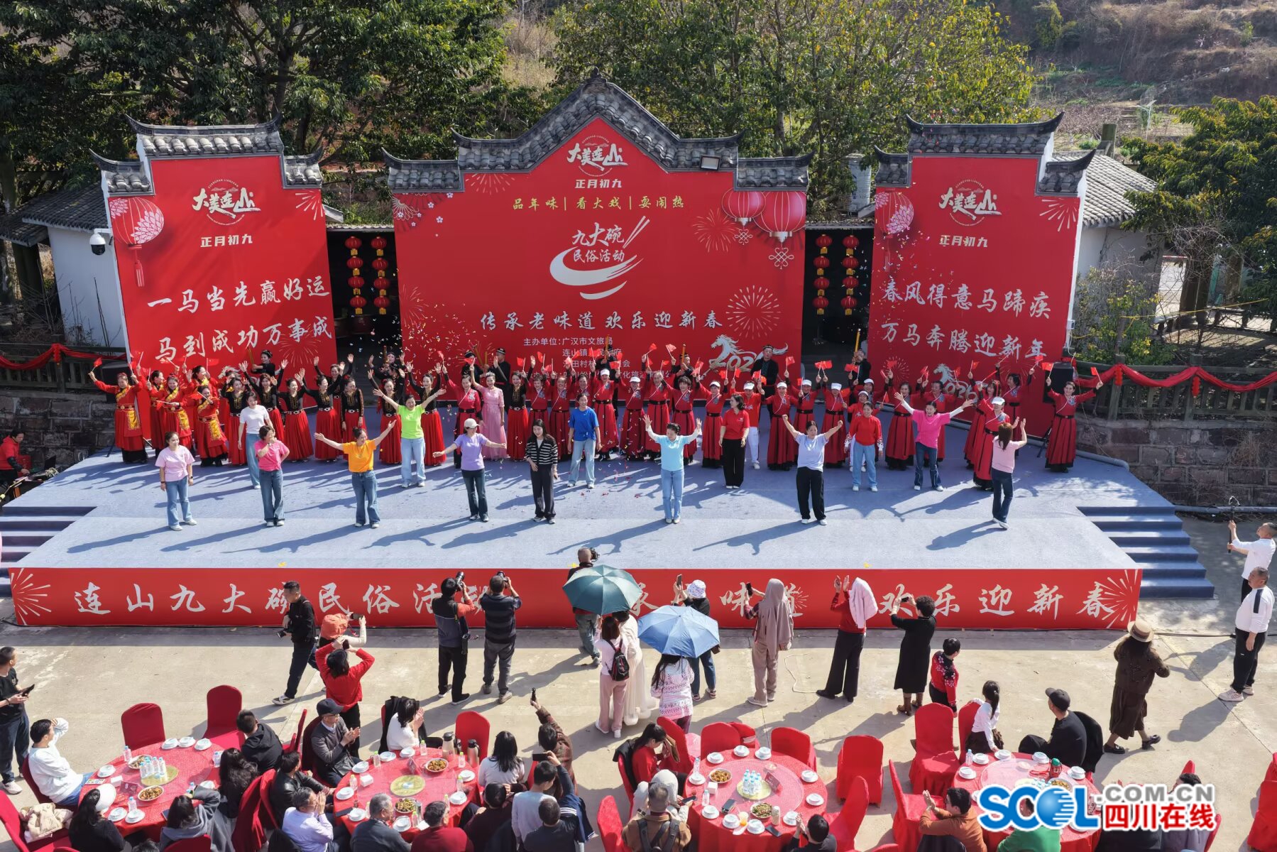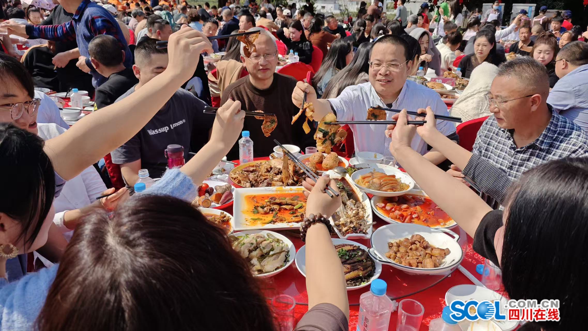 四川在线消息(德阳频道 周玉琴 唐茜)2月25日,农历正月初九,广汉市连山镇沙田村一年一度的传统民俗活动“九大碗”热闹开席。红堰广场与九大碗广场上人头攒动、笑语欢声,八方宾朋围坐在一起,在热气腾腾的坝坝宴中感受新春的团圆暖意,品味地道的川西乡村风情。
