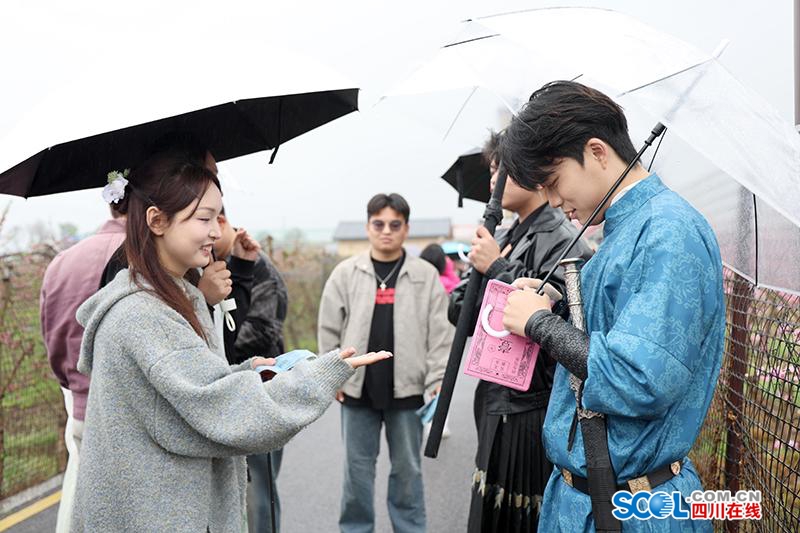 在文永村的百亩桃林,尽管春雨绵绵,但游客热情不减。雨雾中的桃林诗意盎然,粉白花瓣沾着雨珠更显娇嫩。游客撑伞漫步于心形桃花廊道,或驻足拍照,或参与互动,欢声笑语在花海间回荡。全民八段锦展演舒展有力,与自然相融;百米乡村振兴长卷前,众人齐绘美好愿景;“王员外招亲”情景剧热闹上演,游客抢绣球、现场“拜堂”,沉浸式体验传统文化乐趣。身着古装的NPC穿梭林间,演绎民俗故事,让游客从“看客”变为“剧中人”。