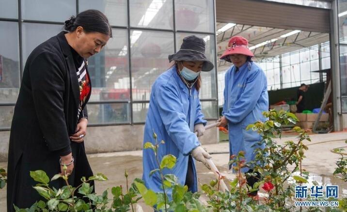 在金山玫瑰产业基地,陈望慧(左)在指导工人给玫瑰花浇水(4月14日摄)。新华社记者 王曦 摄