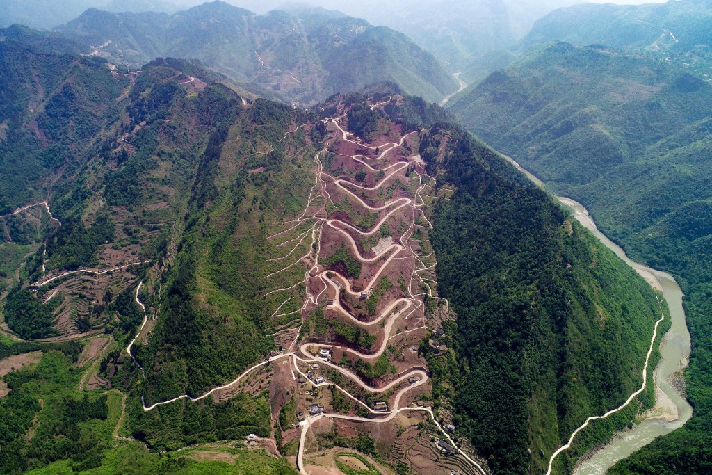 2020年5月7日,俯瞰乌蒙山叙永县水潦乡至古蔺县太平镇农村扶贫公路——古蔺县椒园镇境内十二道拐段。由于该路段造型独特,吸引了不少摄影爱好者前往拍摄,逐渐成为一条“网红”路。牟科 摄(视觉四川)