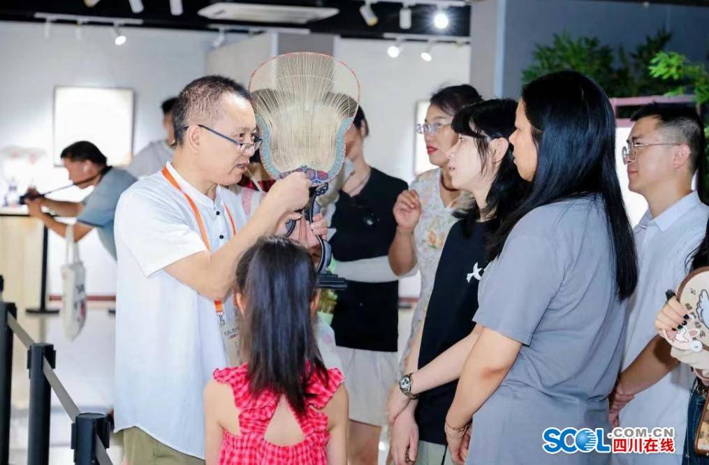 展览现场吸引了众多市民驻足欣赏,感受德阳潮扇的独特魅力。展品陈列区通过珍贵历史文献、老照片和制作工具等,梳理出德阳潮扇的发展脉络,让观众清晰了解其从实用工具到文化珍品的蜕变。制作精良、美轮美奂的精品潮扇令在场观众纷纷拍照打卡,赞不绝口。手作体验区同样热闹非凡,省级非遗代表性传承人亲自演示,市民亲手编织扇骨、绘制扇面,沉浸式感受潮扇制作工艺的魅力。