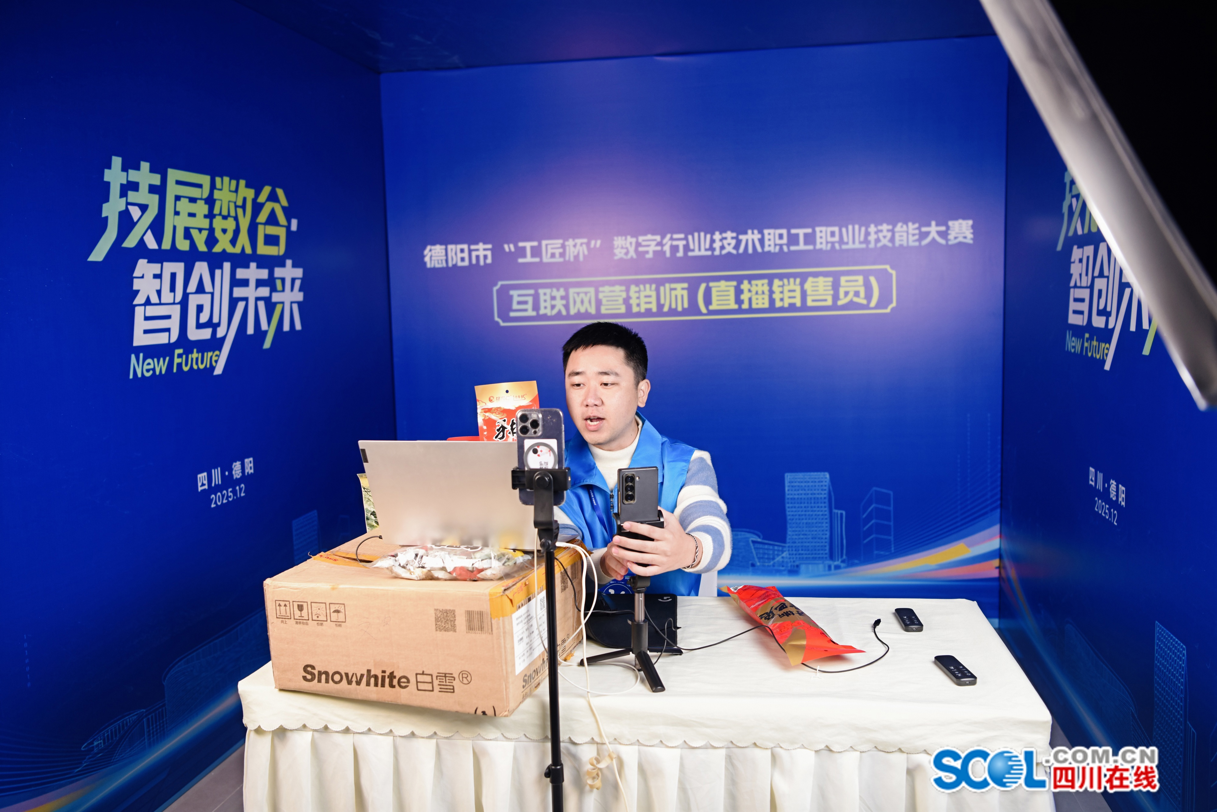 开幕式后,三大赛项实操竞赛正式展开。选手们分赴德阳天府数谷“智慧之心”与四川司法警官职业学院两个赛区,将完成理论考核与实操比拼,全面展示数字技能与创新实力。在互联网营销师实操环节,选手需在规定时间内完成实景主题直播与产品销售直播。销售直播中,各位选手化身“带货达人”,推介手撕哑巴兔、花生酥等本土特产;实景直播则“就地取材”,以赛事举办地天府数谷“智慧之心”为对象,通过竞赛向外界推介德阳数字经济载体的资源与优势。