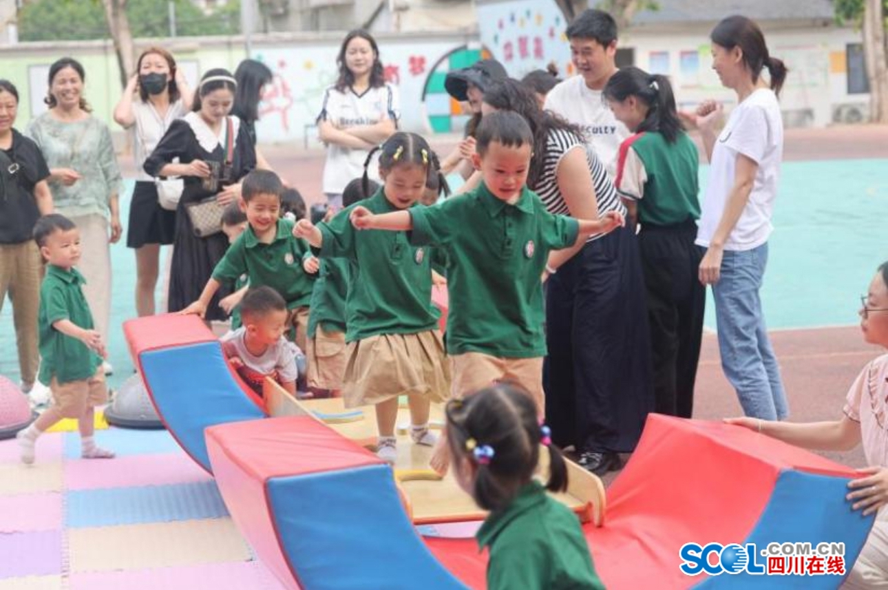 活动现场,在室外亲子活动区,家长带着孩子体验亲子活动,在走平衡木、跨越软体障碍物、钻爬阳光隧道等环节中收获了育儿新知识。