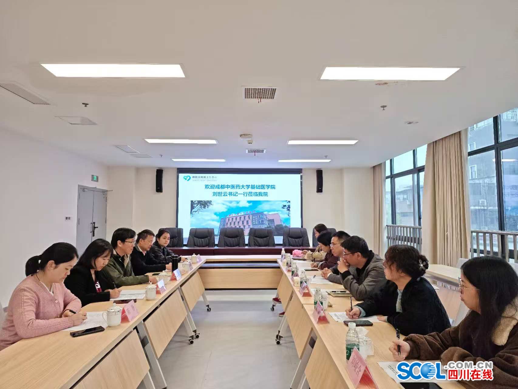 成都中医药大学基础医学院与德阳市精神卫生中心工作人员现场交流。