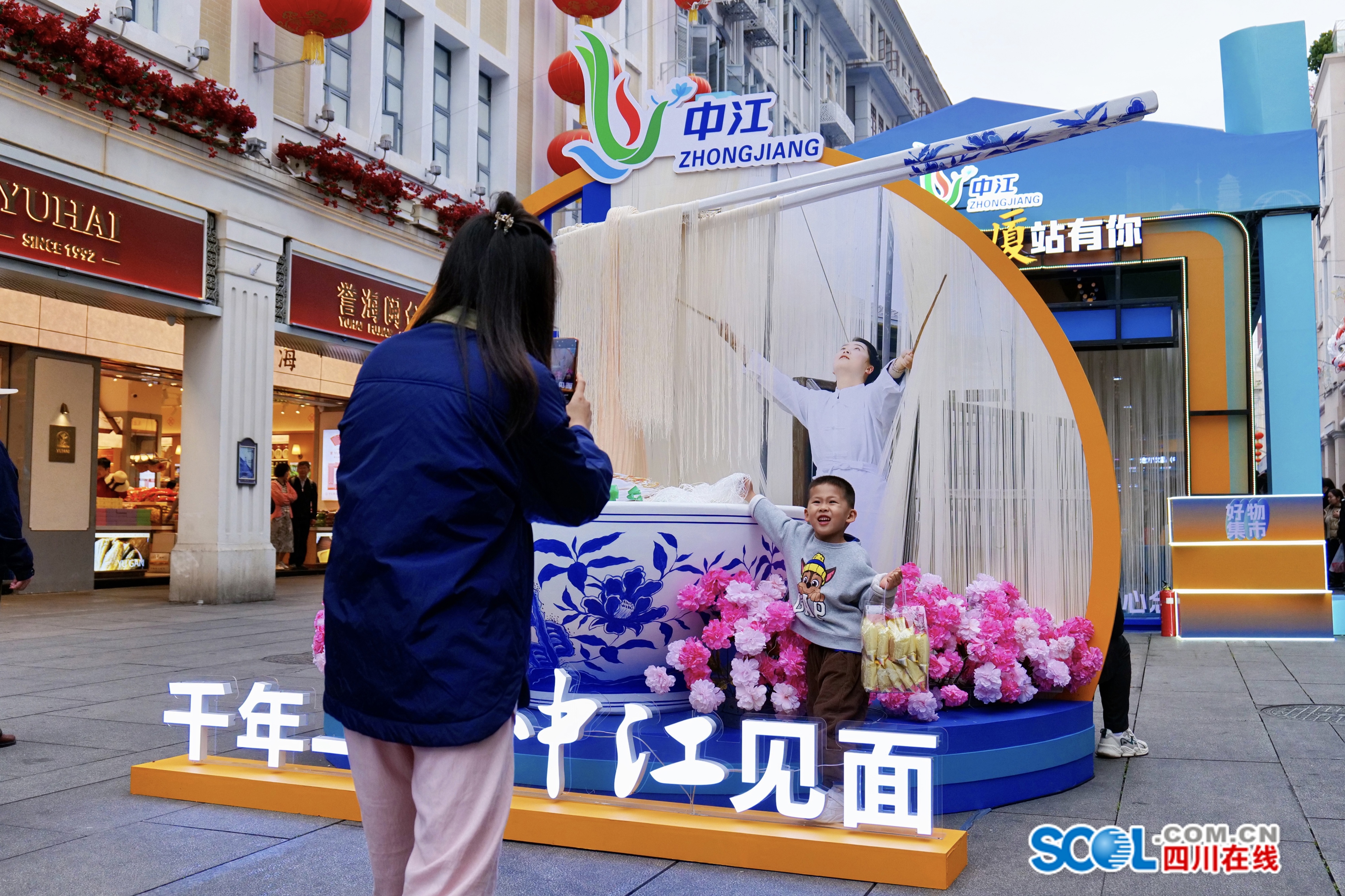 位于厦门中山路核心地段的“德阳好物”集市共设名酒品茗、生态农产品、名优特产品、火锅产业、电商直播五大展区,并搭建电商直播间,实现线上线下联动体验。集市入口处,一座巨型青花瓷大碗与垂落如瀑的中江挂面装置成为现场热门打卡点,吸引众多市民驻足合影,展现“看得见的非遗”的独特魅力。