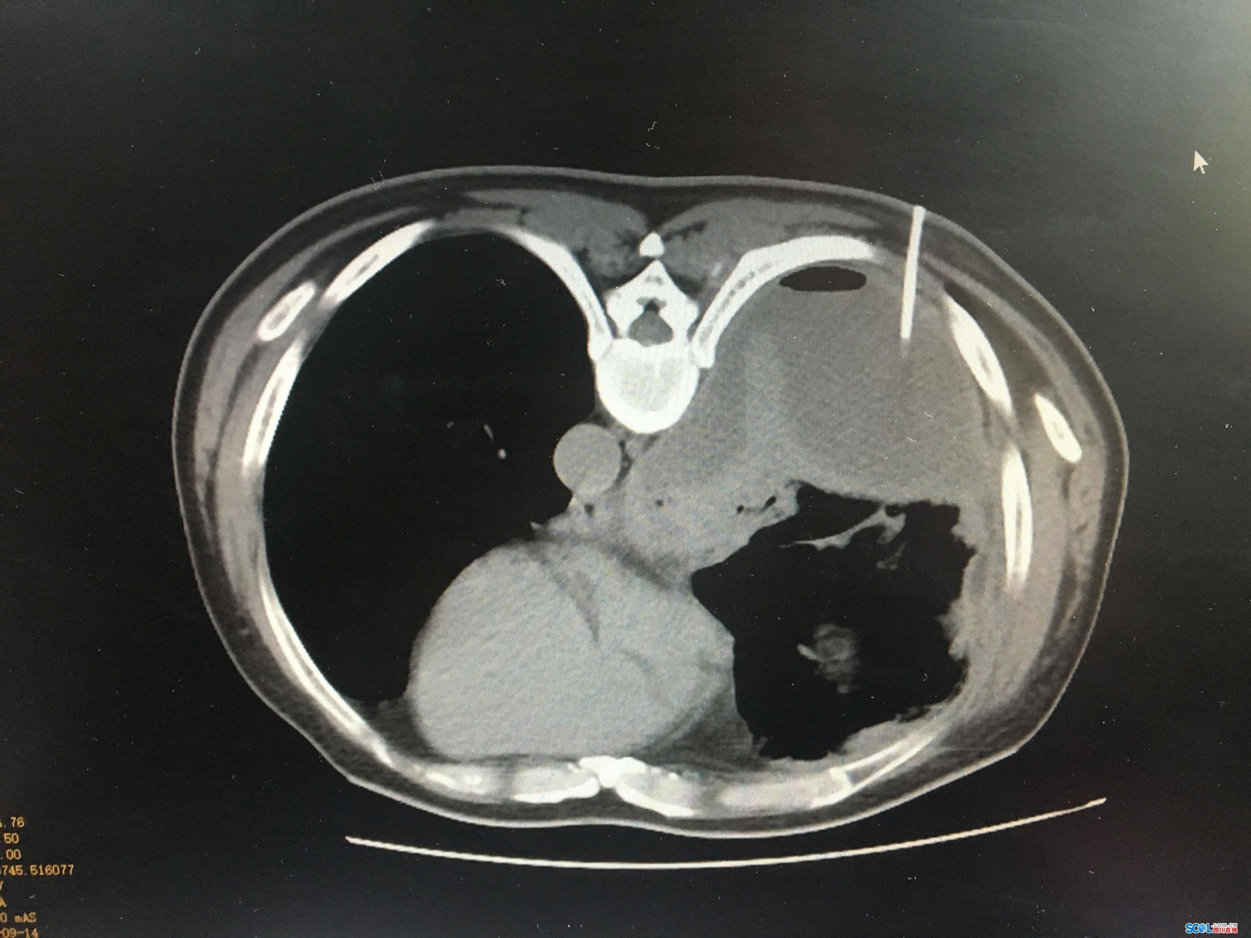 9月14日,呼吸与危重症医学科在CT引导下为该患者行胸膜穿刺术,顺利取出右侧增厚胸膜组织;抽出黄绿色黏稠带臭味的脓性胸腔积液;并安置了胸腔微创闭式引流管。此次操作为一次穿刺三项诊疗,谓之“一举三得”。整个过程不到20分钟,术中及术后患者无任何不适。目前患者已经引流出大量脓性胸腔积液,相关检查提示为感染性脓胸,经对症用药,现患者症状已明显减轻。(蔡维玲 张文莉)